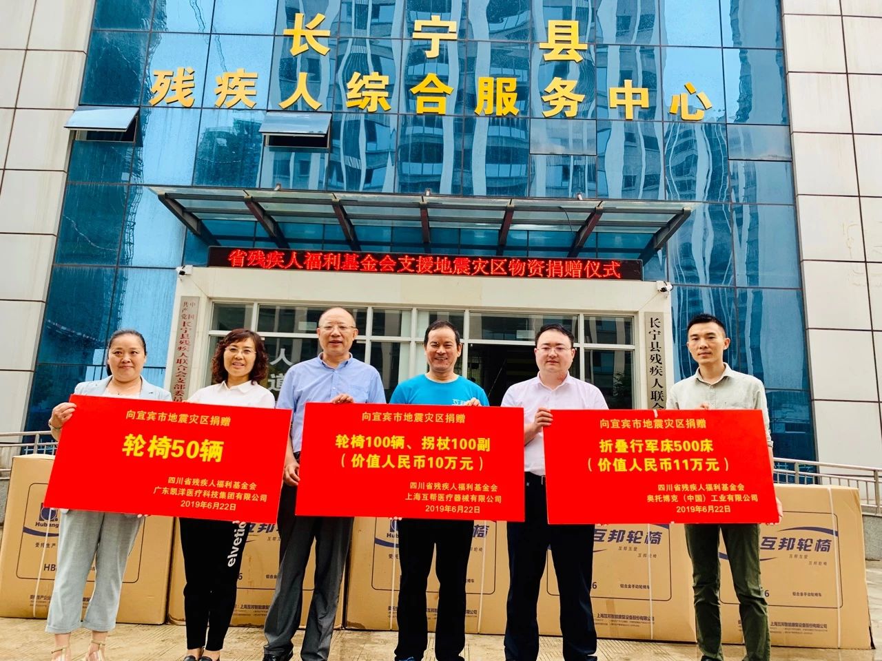 2019年6月21日,互邦董事長賀金銘與四川省殘疾人聯(lián)合會理事楊生明共同簽署,為四川宜賓地震災區(qū)捐獻康復器具。